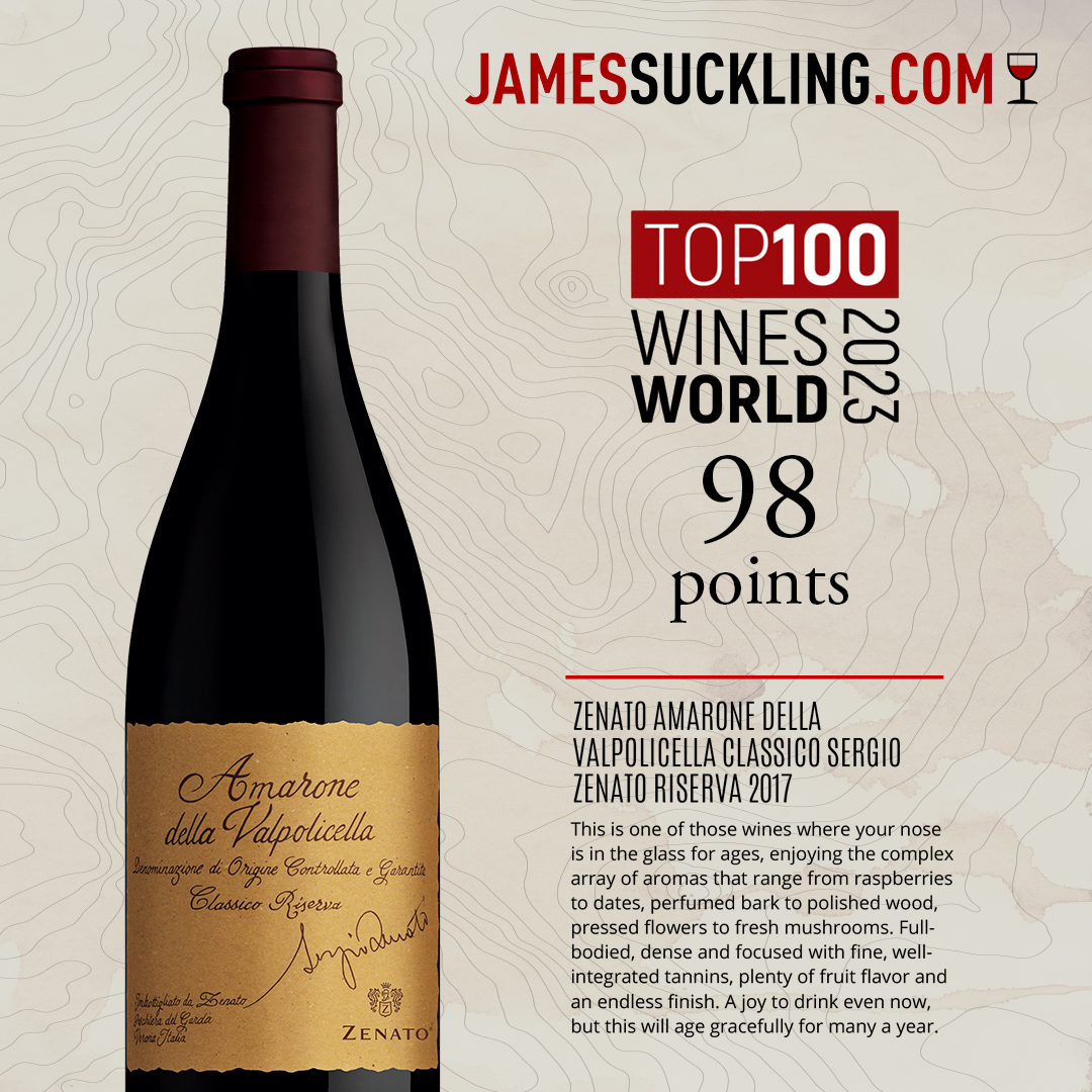 L’Amarone Riserva Sergio Zenato 2017 è stato selezionato con il punteggio di 98/100  tra i 100 migliori vini al mondo nella Top 100 World Wines 2023 di James Suckling, uno dei critici più influenti a livello internazionale.